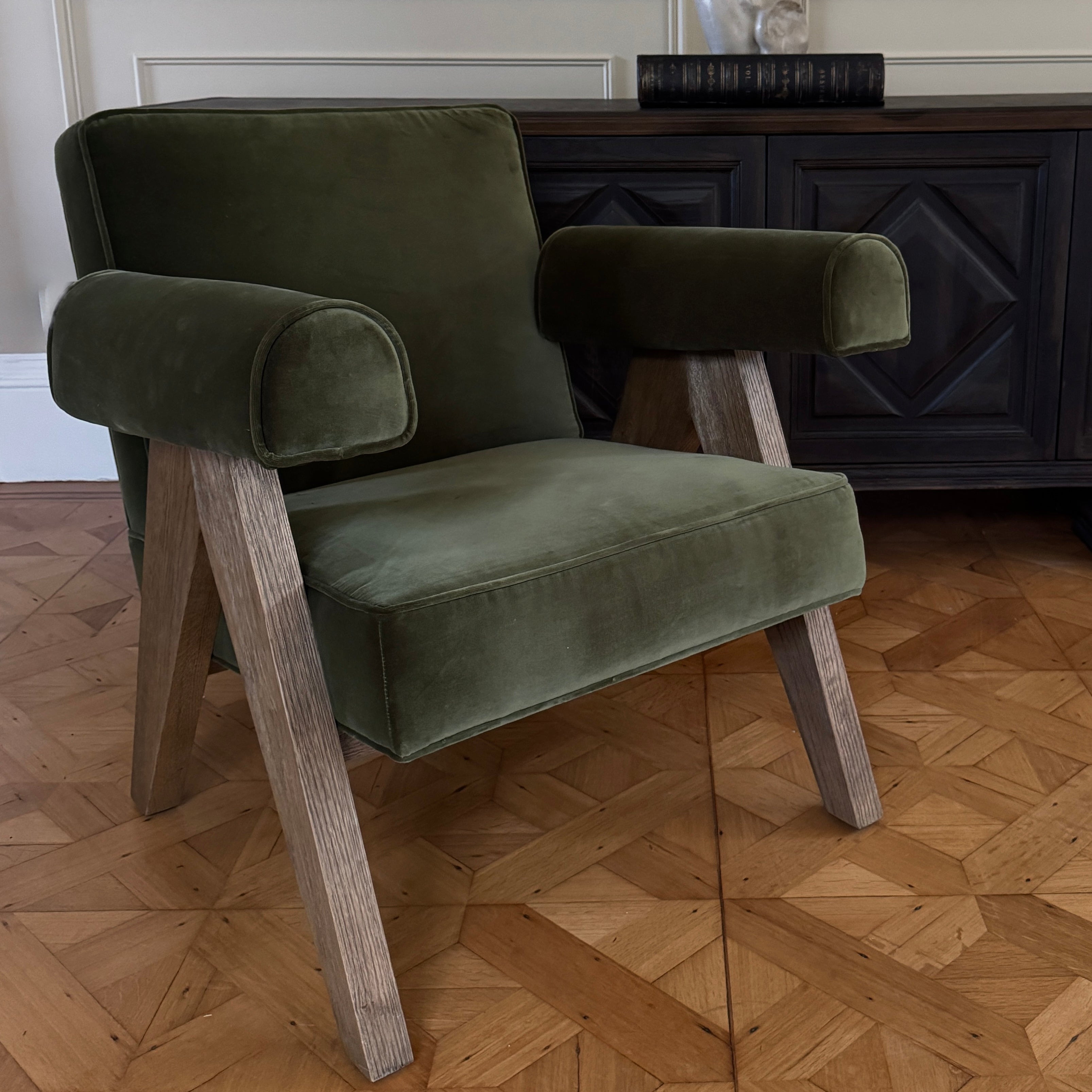 A quietly striking accent chair upholstered in rich olive cotton velvet, paired with a solid oak frame for warmth and contrast. The gently angled legs and wraparound arms create a sculptural silhouette, while the deep seat and supportive back offer everyday comfort.