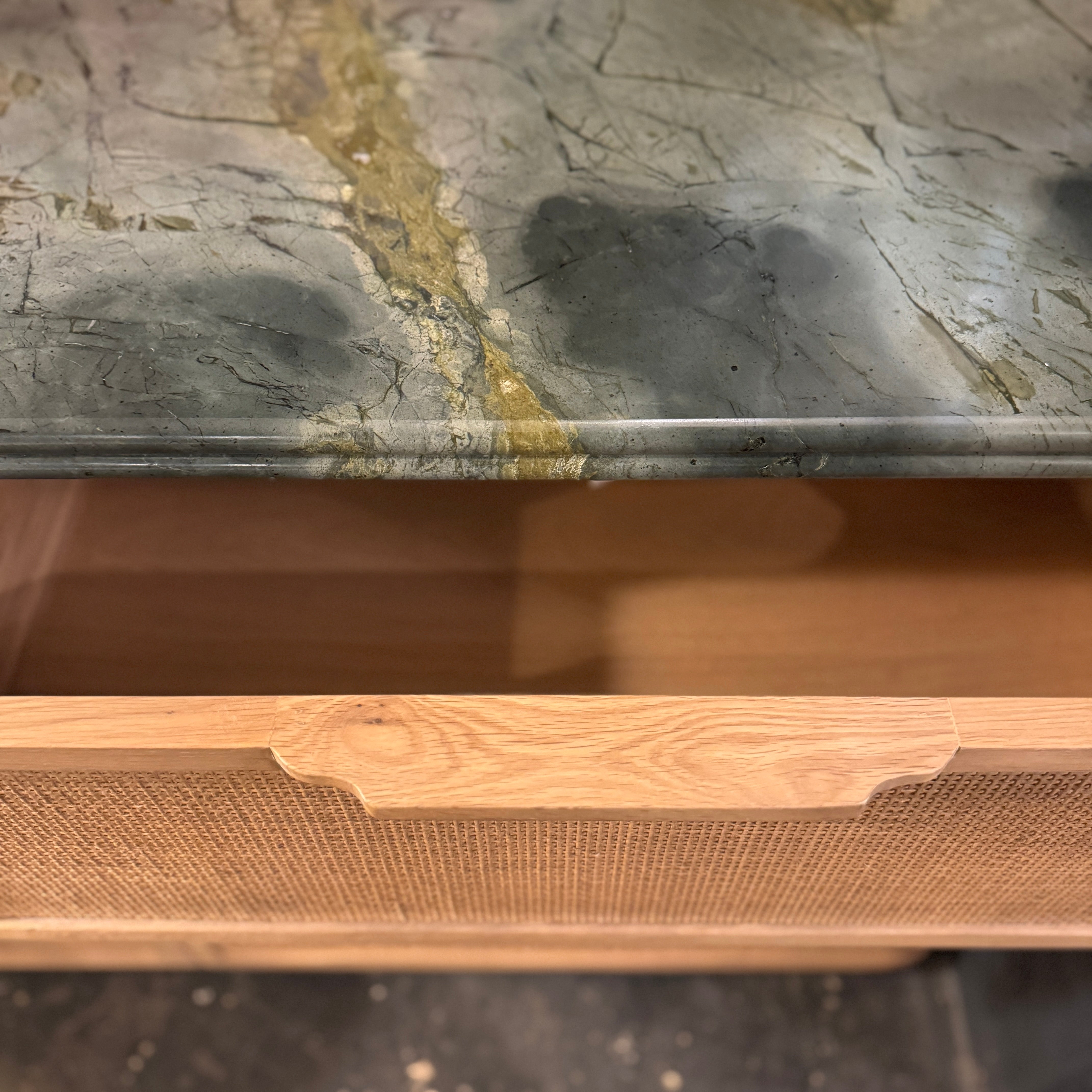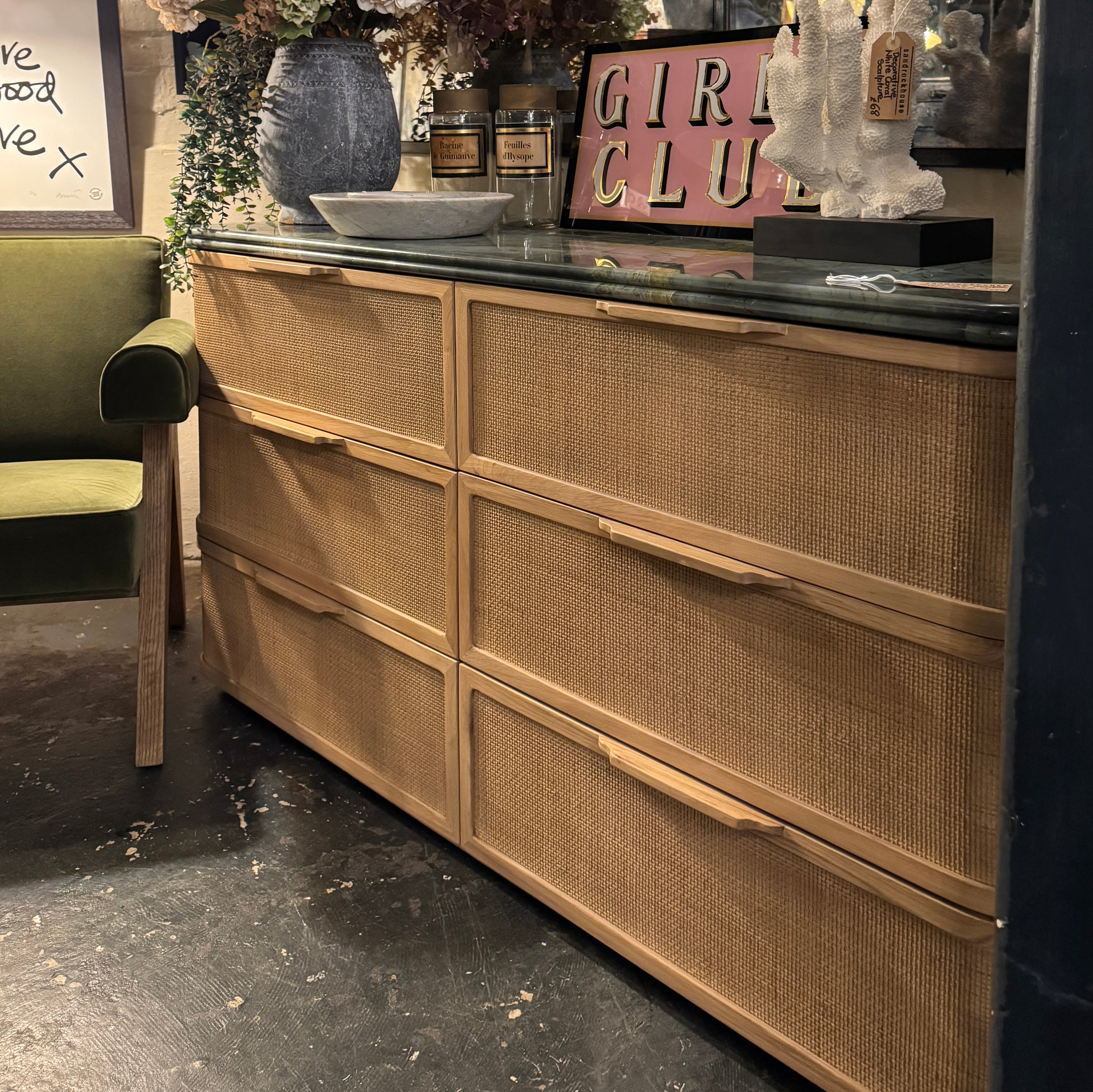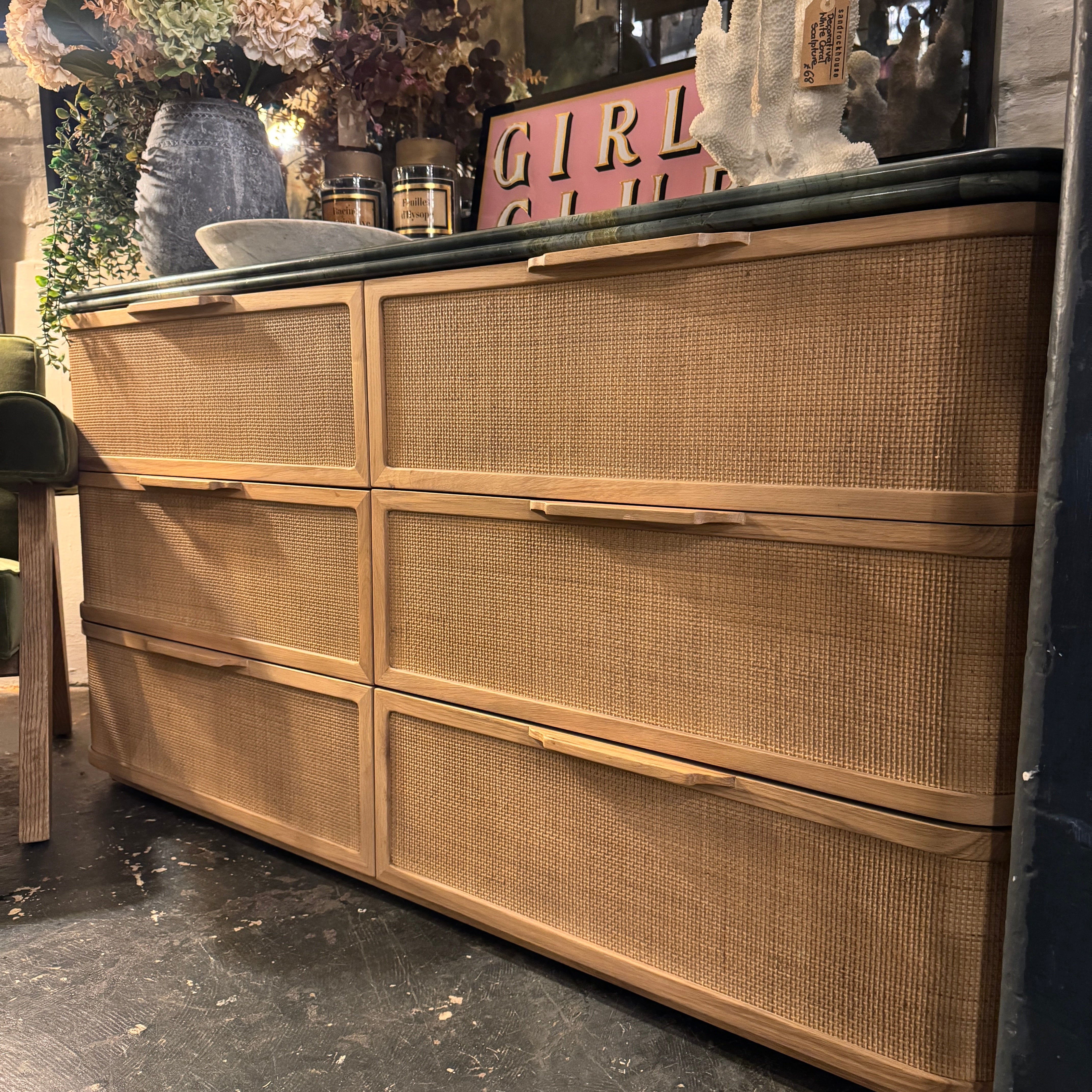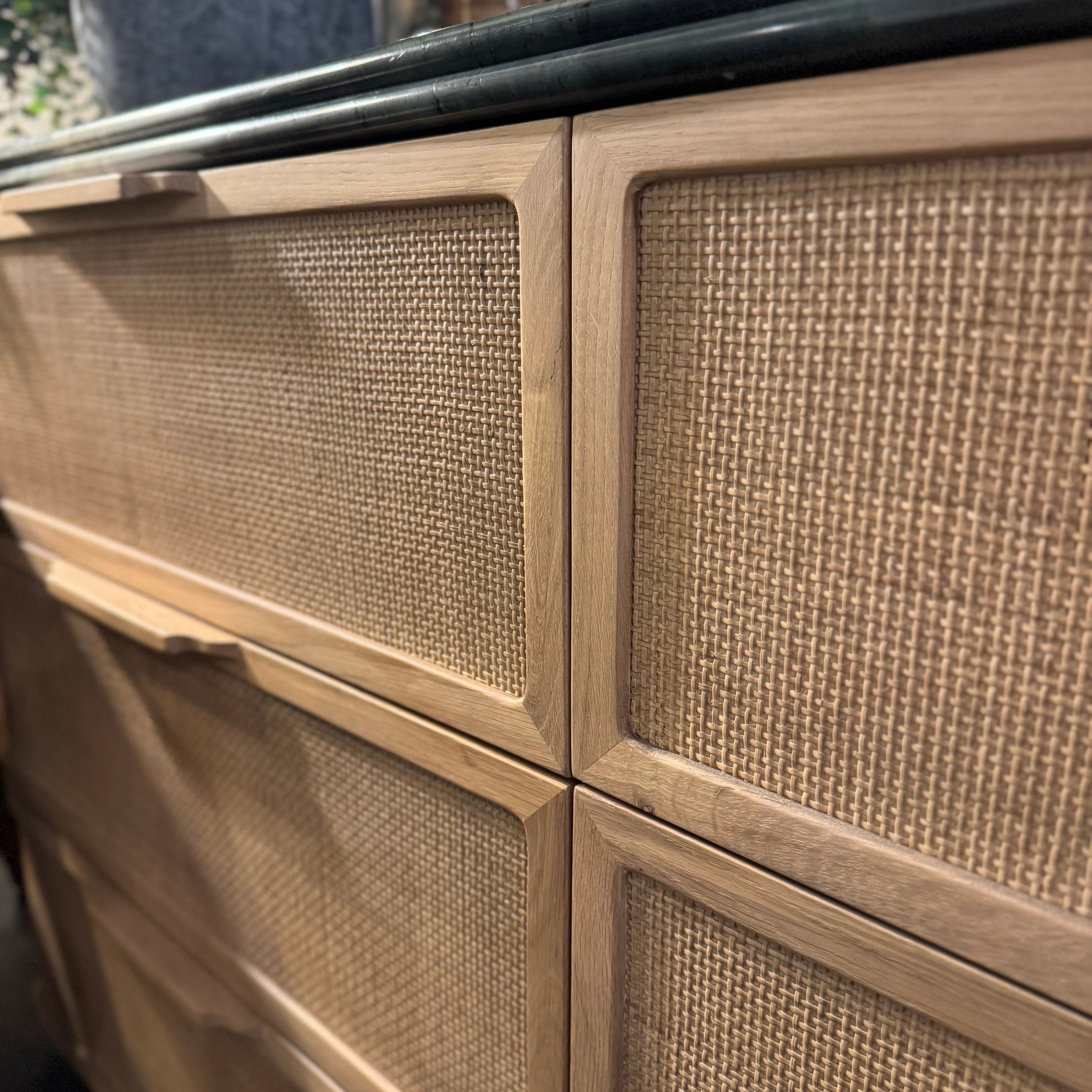 This striking chest of drawers combines natural oak with woven rattan drawer fronts and a luxurious green marble top with a double bullnose edge.