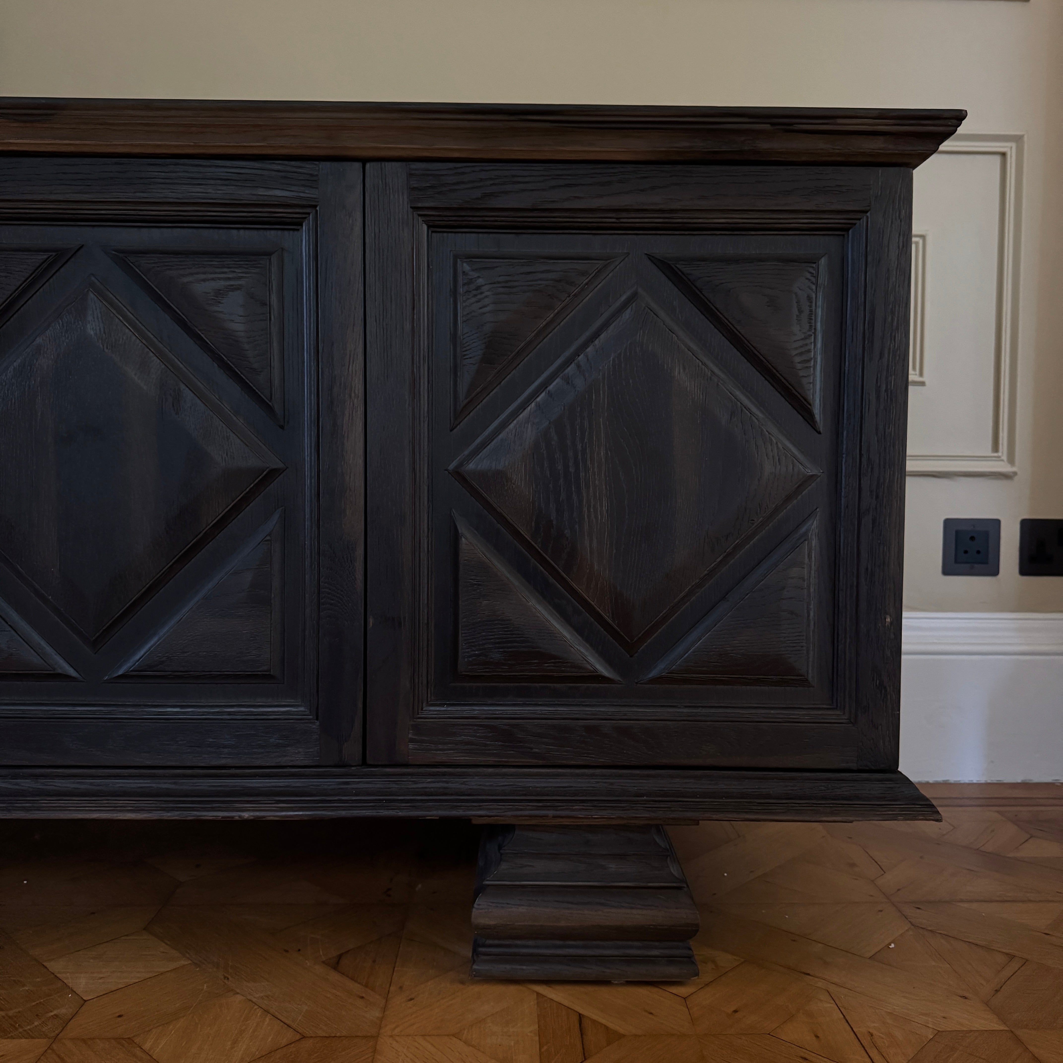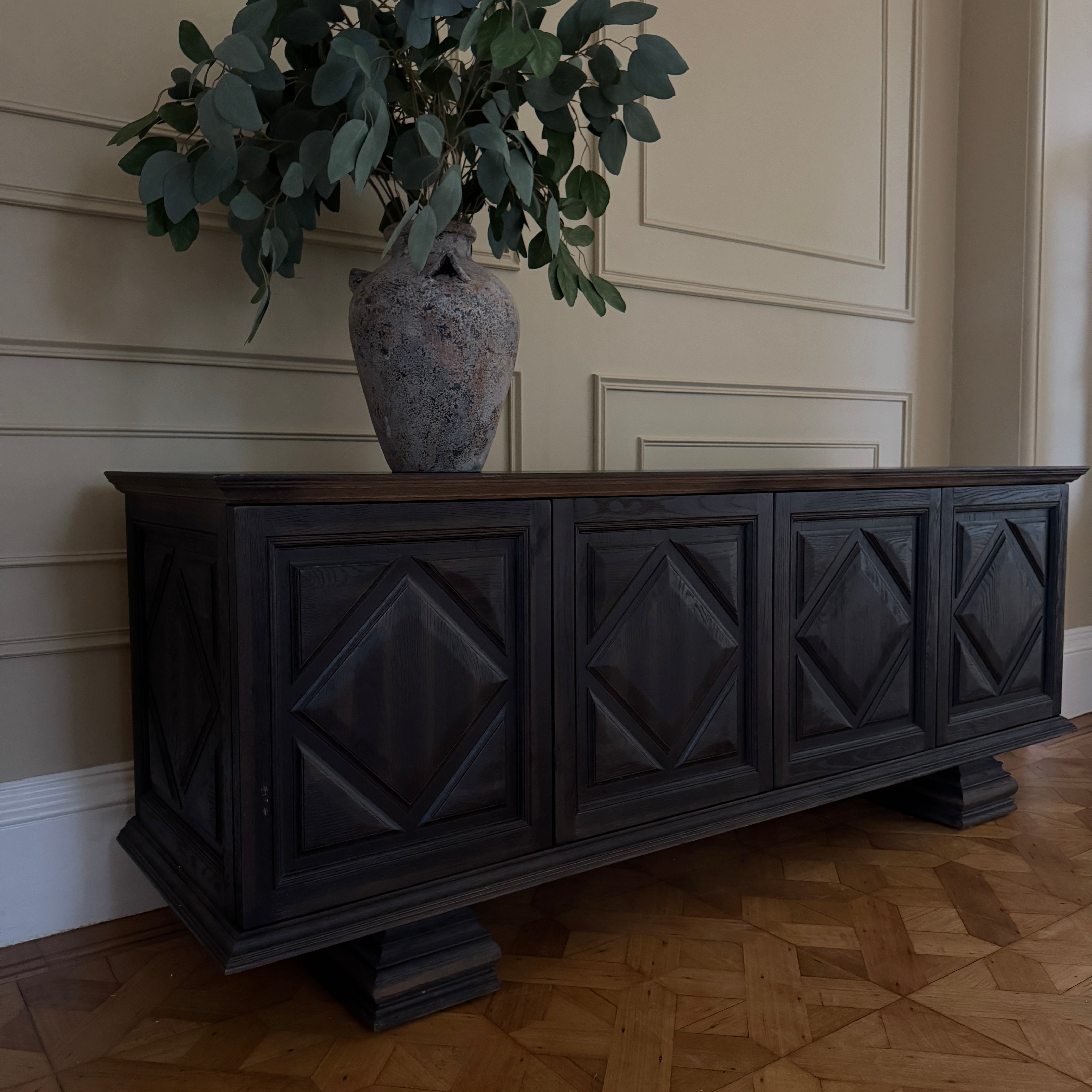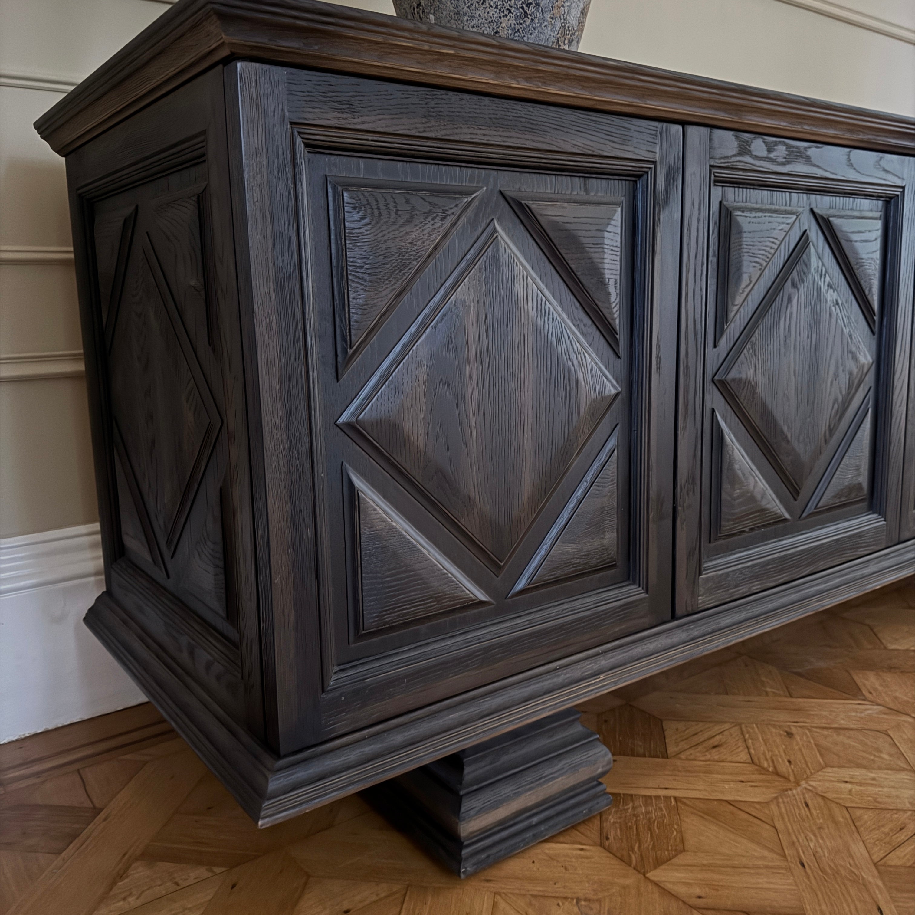 This gorgeous substantial sideboard is an ode to furnishings from the 17th and 18th century. Offering a detailed daimond panelling, it evokes a sense of style that can bring a statement to any room.