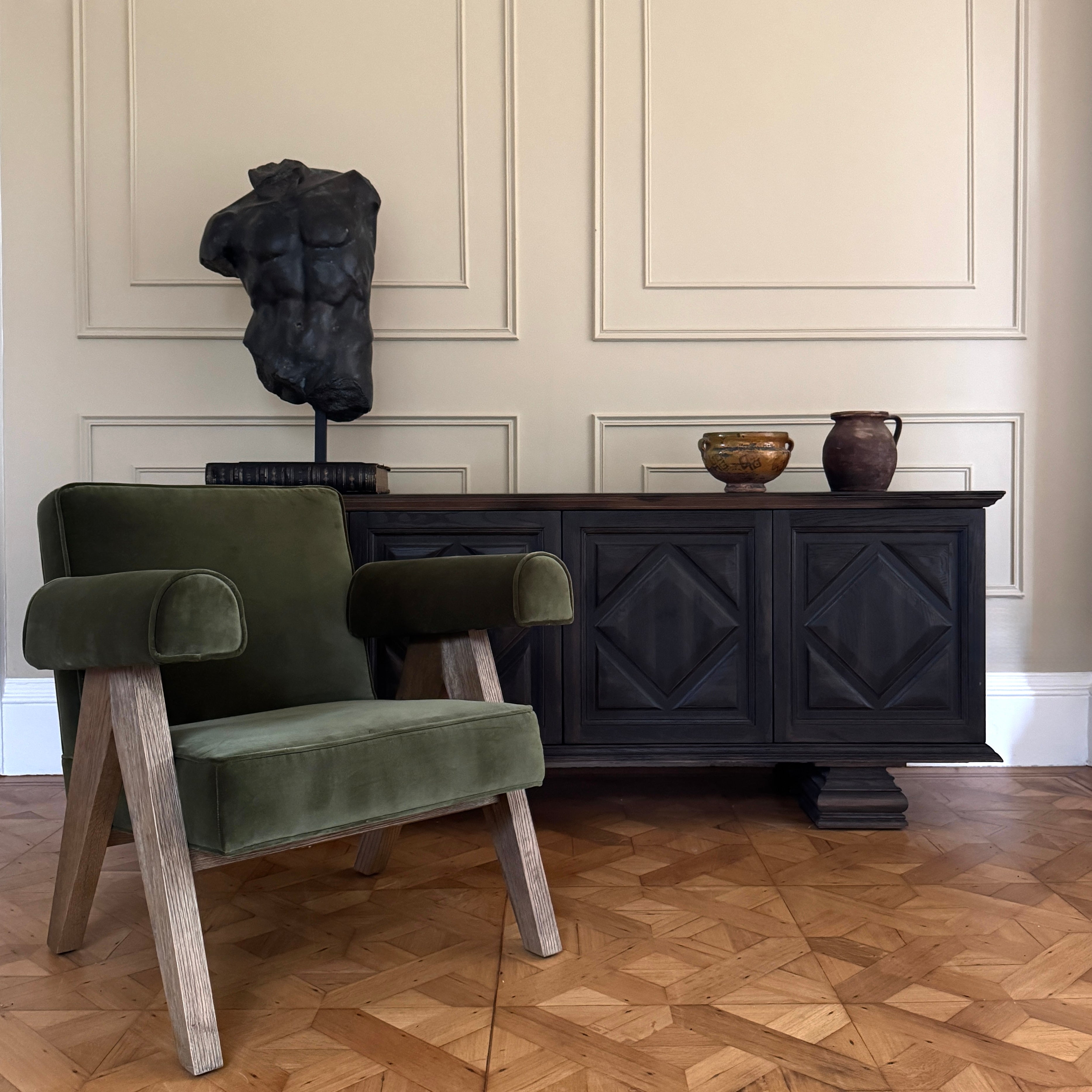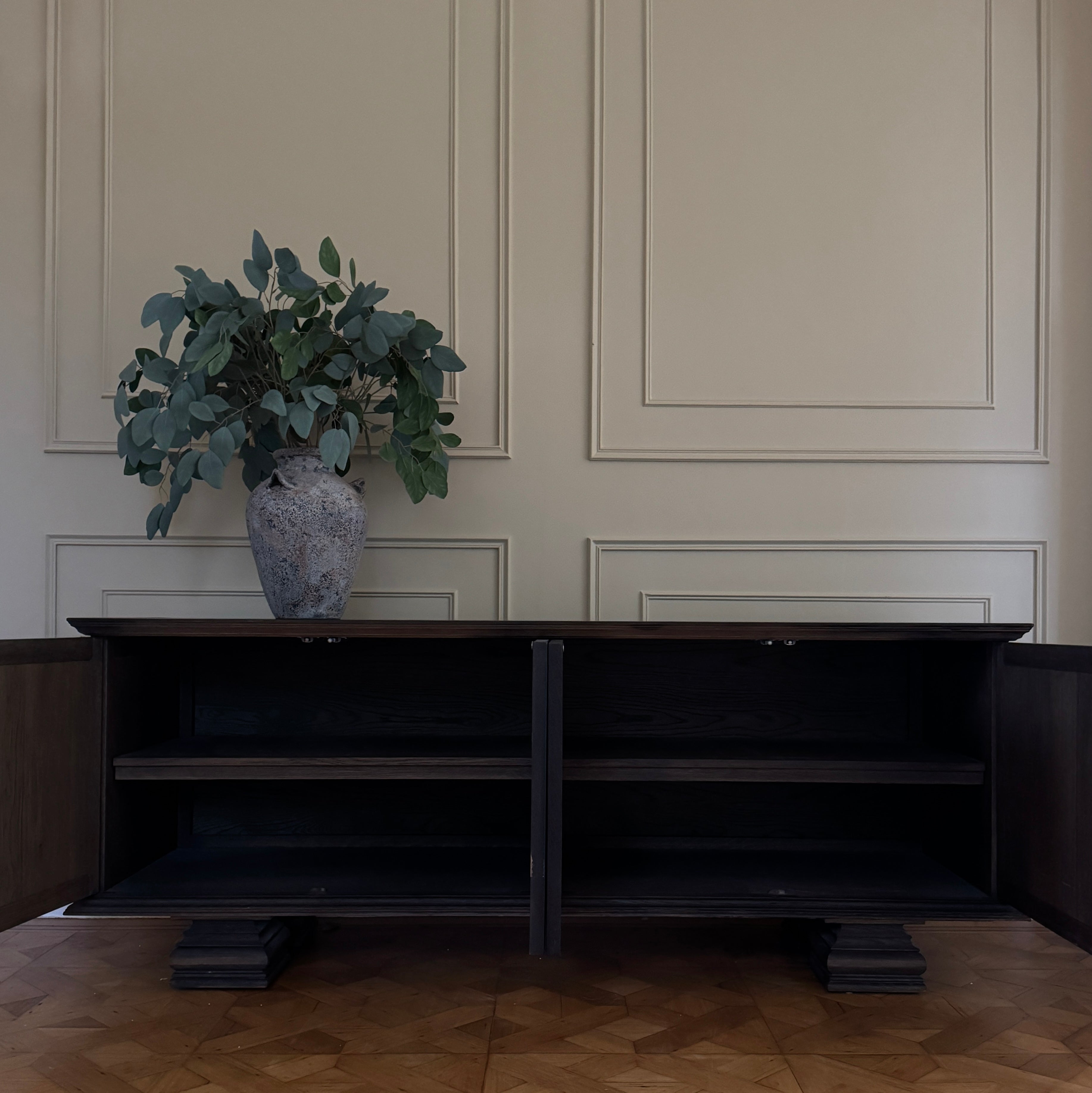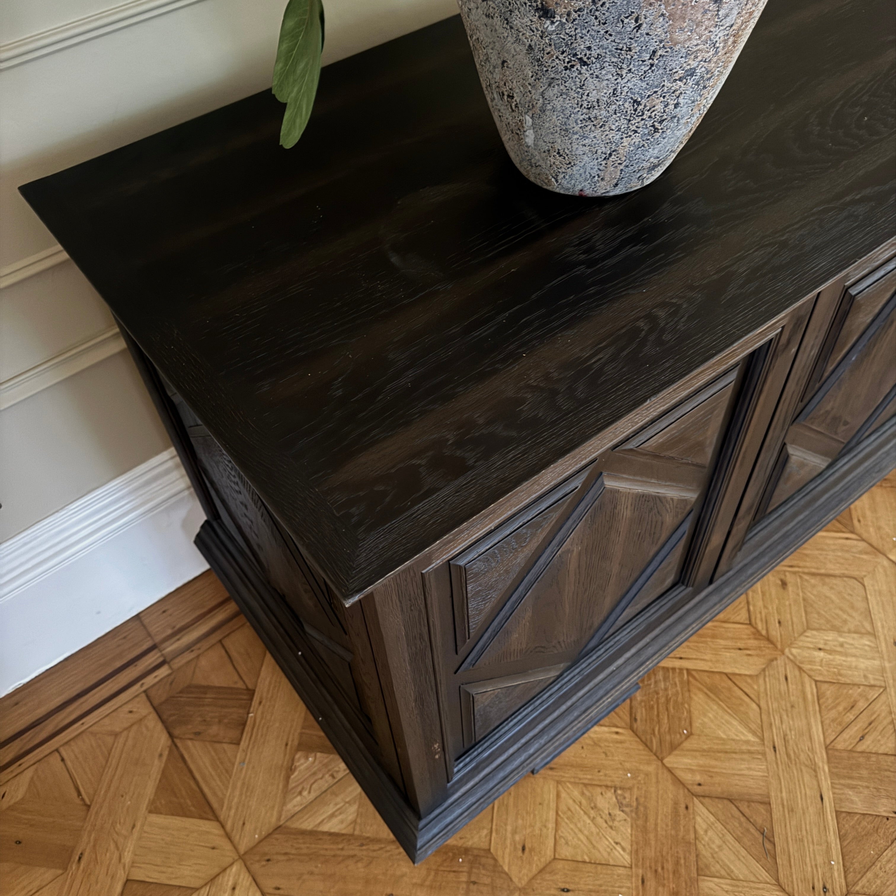This gorgeous substantial sideboard is an ode to furnishings from the 17th and 18th century. Offering a detailed daimond panelling, it evokes a sense of style that can bring a statement to any room.