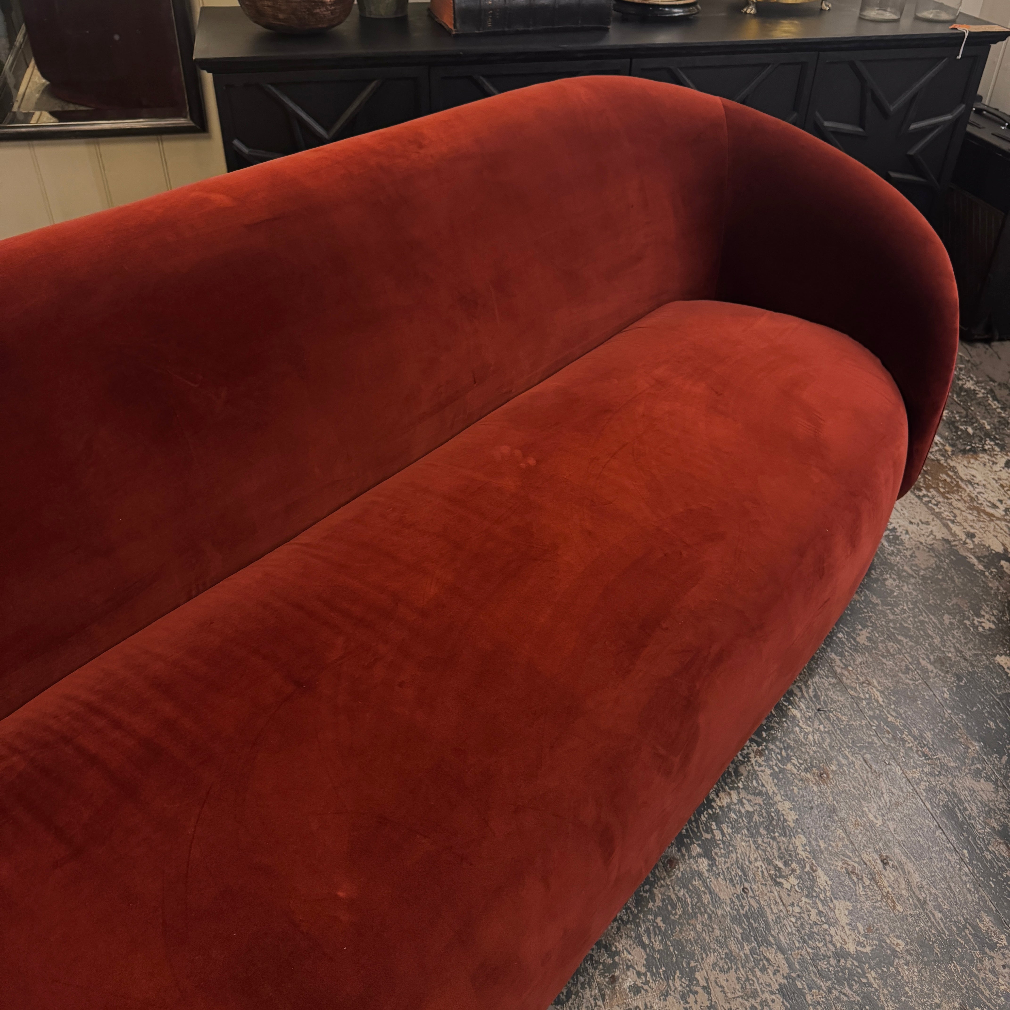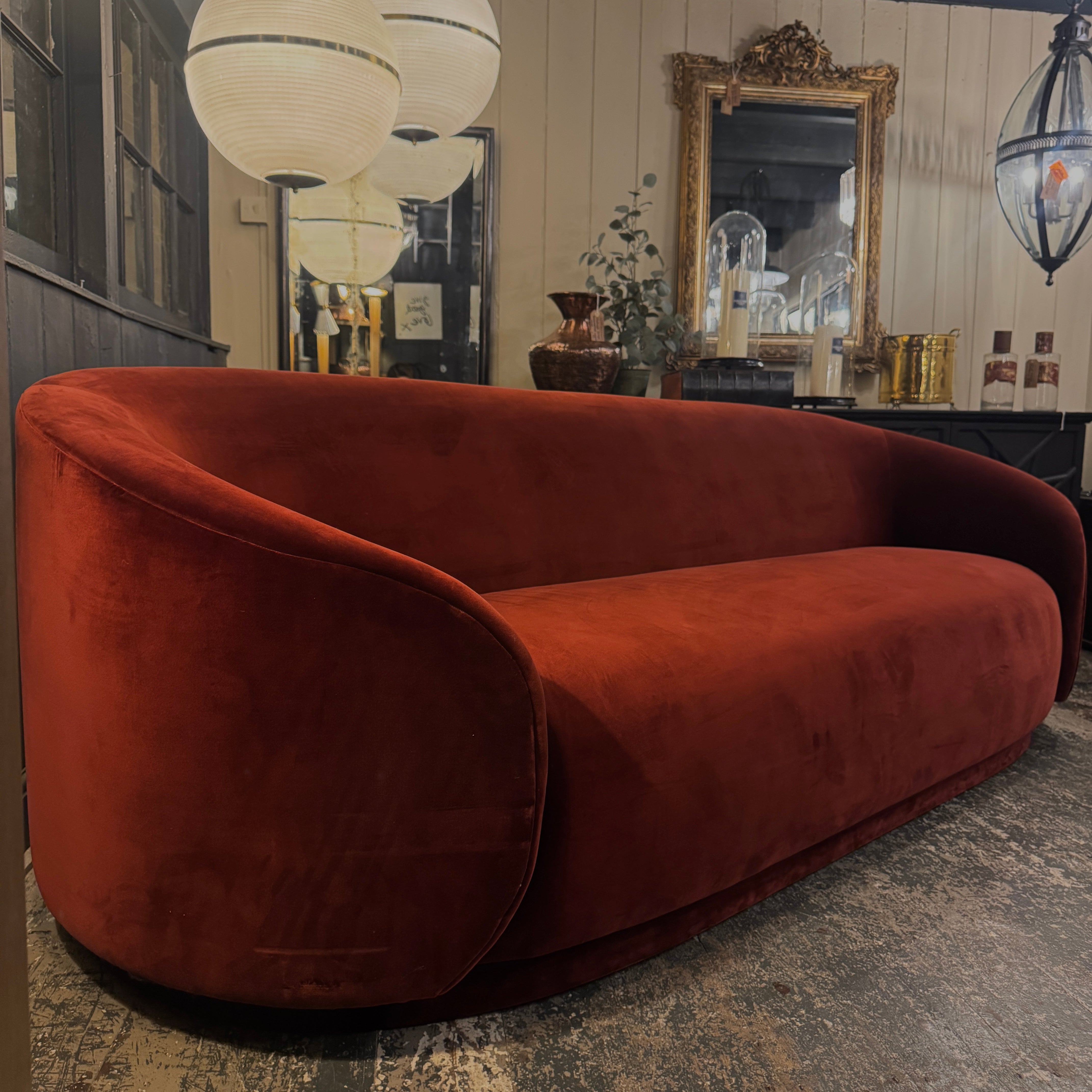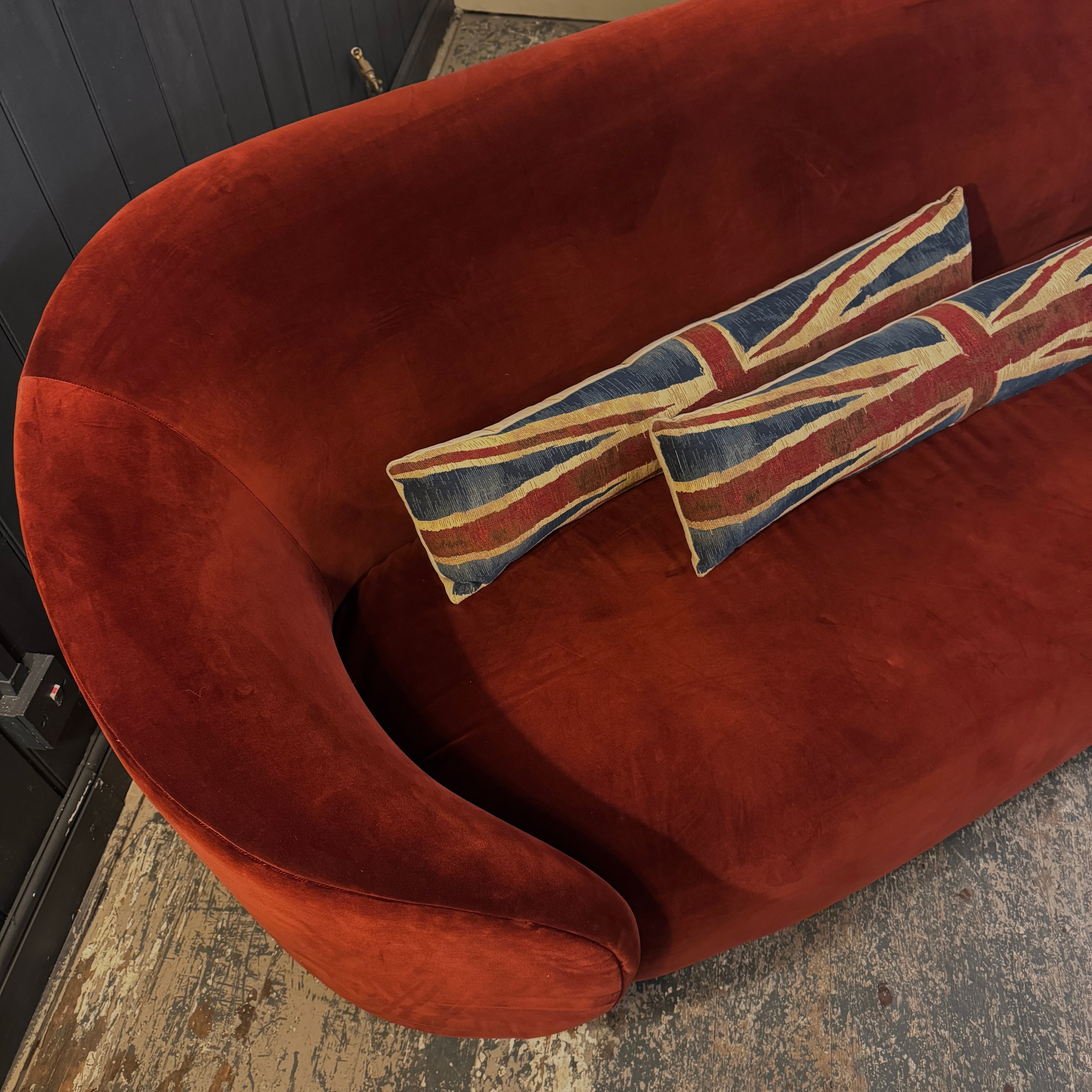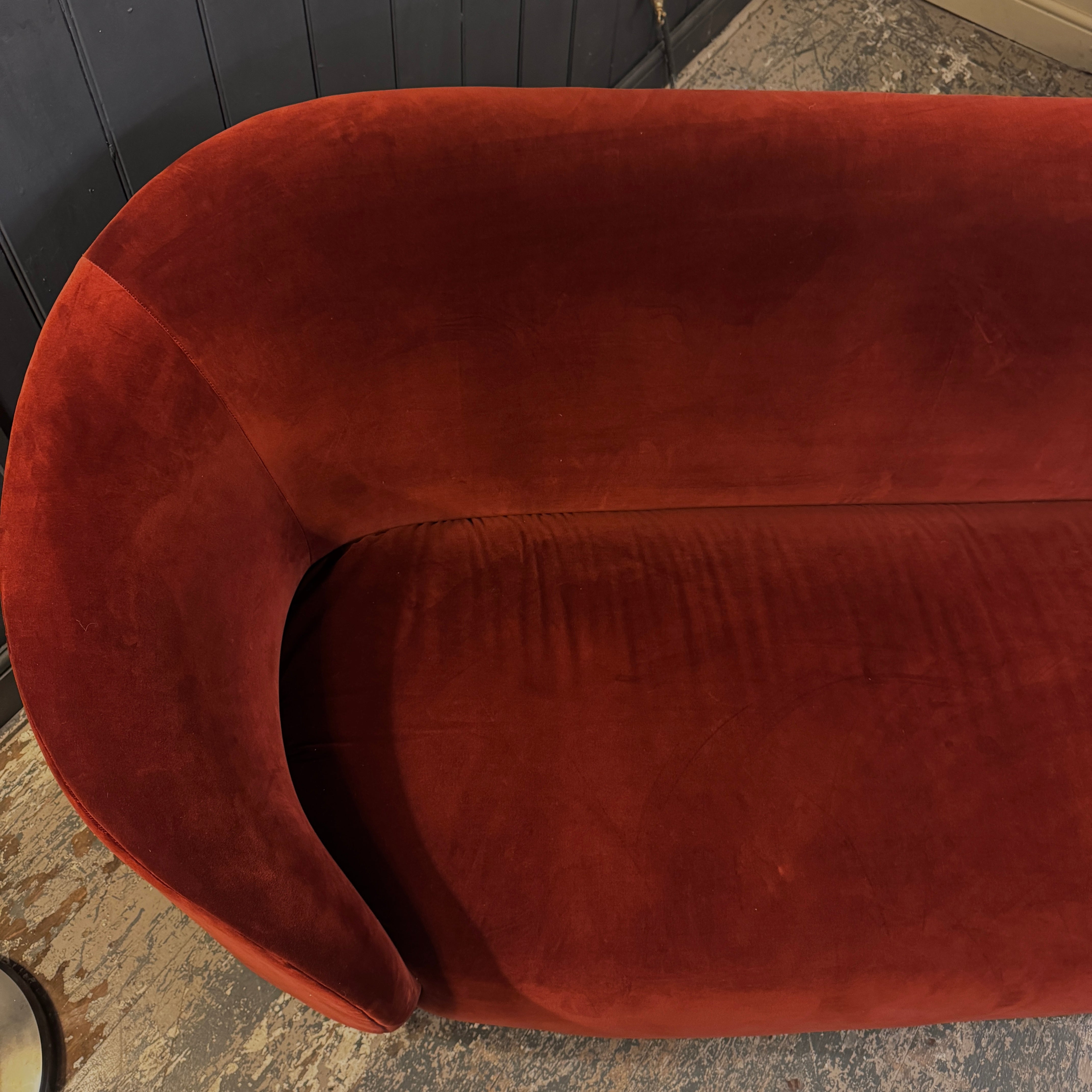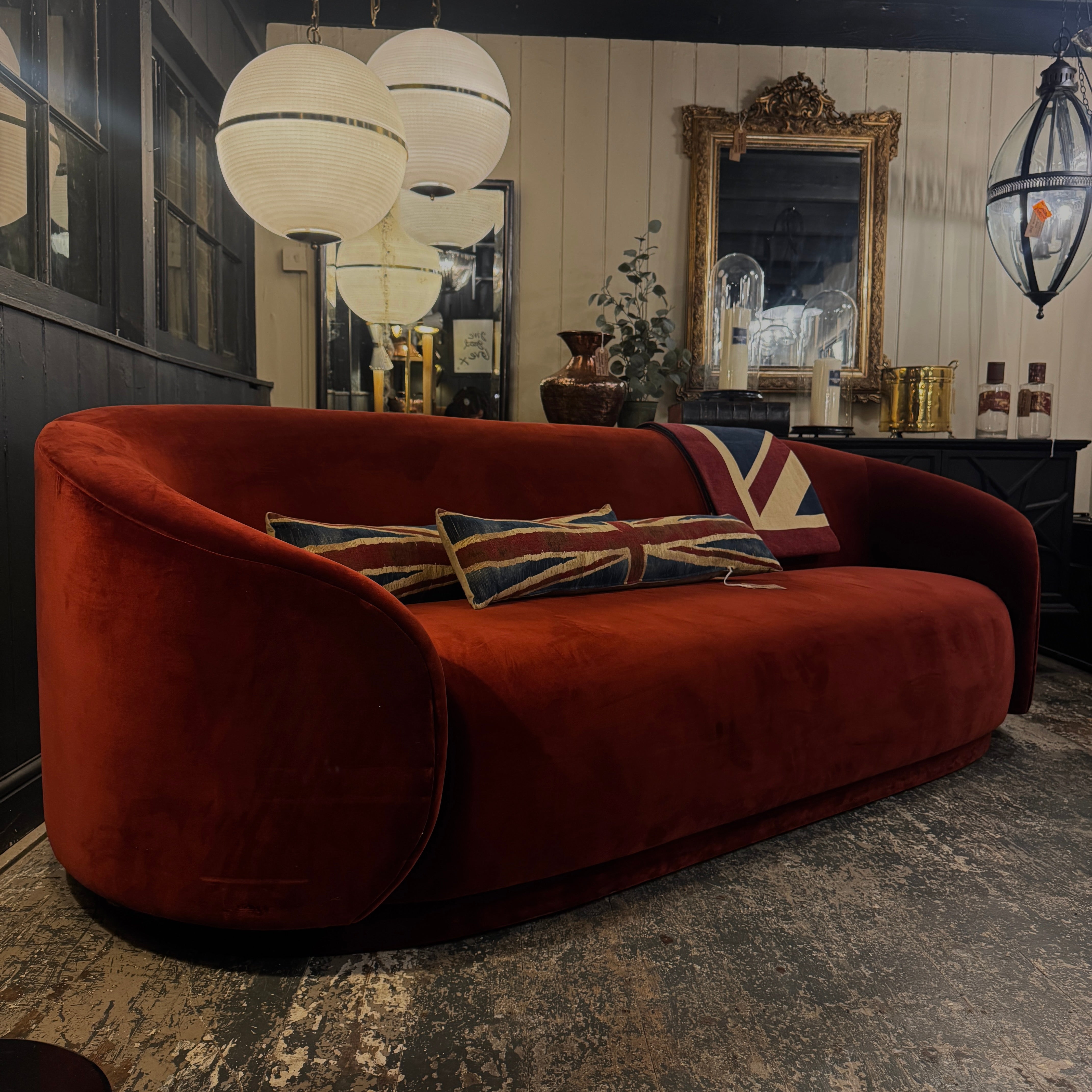 This striking 4-seater sofa commands attention with its sophisticated mid-century design and luxurious deep red velvet upholstery. Drawing inspiration from the glamorous aesthetic of the 1950s and 60s, it brings timeless elegance and dramatic flair to any interior space. The clean, streamlined silhouette with refined proportions that define the era, while the sumptuous velvet fabric adds tactile richness and visual depth.